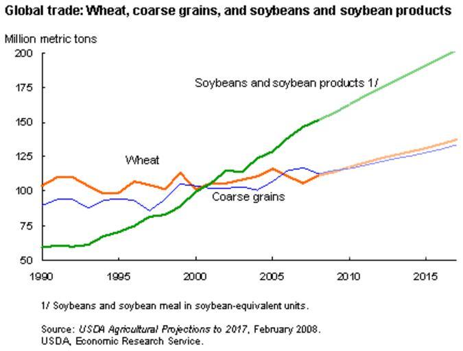 | Keywords: GlobalTrade wheat coarse grain soy 2008 usda.png graph Global trade in soybeans and soybean products has risen rapidly since the early 1990s and has surpassed not only wheat ”the traditional leader in agricultural commodity trade ”but also total coarse grains corn barley sorghum rye oats millet and mixed grains Continued strong growth in global demand for vegetable oil and protein meal particularly in China is expected to maintain soybean and soybean-product trade well above wheat and coarse grains trade throughout the next decade Wheat coarse grains and oilseeds including soybeans compete with each other and with other crops for limited cropland Higher prices for vegetable oils partially the result of increased demand for biodiesel are bringing previously uncropped land in Brazil and Indonesia into soybean and palm oil production http //www ers usda gov/briefing/Baseline/gallery/gallery2008/GlobalTrade gif 2008 Economic research unit of the USDA us federal gov pd-us gov Updated version 2008-04-08 convert to PNG fade projections on graph PD-USGov Macroeconomics Economy of Africa Peak oil International economics Riots Famines Economy of Asia 2008 diagrams Market diagrams 2000s |