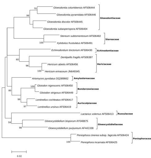 Keywords: Gloeodontia-Maximum Likelihood-Tree.svg Figure Molecular Phylogenetic analysis of Gloeodontia by the Maximum Likelihood method <br/> The evolutionary history was inferred by using the Maximum Likelihood method based on the Kimura 2-parameter model 1 The tree with the highest log likelihood -5982 7851 is shown The percentage of trees in which the associated taxa clustered together is shown next to the branches only if over 50 Initial tree for the heuristic search were obtained by applying the Neighbor-Joining method to a matrix of pairwise distances estimated using the Maximum Composite Likelihood MCL approach A discrete Gamma distribution was used to model evolutionary rate differences among sites 5 categories +G parameter 0 5405 The rate variation model allowed for some sites to be evolutionarily invariable +I 60 1162 sites The tree is drawn to scale with branch lengths measured in the number of substitutions per site The analysis involved 20 nucleotide sequences All positions with less than 95 site coverage were eliminated That is fewer than 5 alignment gaps missing data and ambiguous bases were allowed at any position There were a total of 1461 positions in the final dataset Evolutionary analyses were conducted in http //megasoftware net/ MEGA6 2 <br/> 1 Kimura M 1980 A simple method for estimating evolutionary rate of base substitutions through comparative studies of nucleotide sequences Journal of Molecular Evolution 16 111-120 <br/> 2 Tamura K Stecher G Peterson D Filipski A and Kumar S 2013 MEGA6 Molecular Evolutionary Genetics Analysis version 6 0 Molecular Biology and Evolution30 2725-2729 <br/> ; List with GenBank Sequences which were used for the ML-Tree http //www ncbi nlm nih gov/nuccore/DQ389662 Artomyces pyxidatus DQ389662 http //www ncbi nlm nih gov/nuccore/AF506387 Dentipellis fragilis AF506387 http //www ncbi nlm nih gov/nuccore/AF506430 Echinodontium tinctorium AF506430 http //www ncbi nlm nih gov/nuccore/AY048875 Gloeocystidiellum bisporum AY048875 http //www ncbi nlm nih gov/nuccore/AF441338 Gloeocystidiellum purpureum AF441338 http //www ncbi nlm nih gov/nuccore/AF506444 Gloeodontia columbiensis AF506444 http //www ncbi nlm nih gov/nuccore/AF506445 Gloeodontia discolor AF506445 http //www ncbi nlm nih gov/nuccore/AF506446 Gloeodontia pyramidata AF506446 http //www ncbi nlm nih gov/nuccore/AF506404 Gloeodontia subasperispora AF506404 http //www ncbi nlm nih gov/nuccore/AF506450 Gloiodon nigrescens AF506450 http //www ncbi nlm nih gov/nuccore/AF506449 Gloiodon strigosus AF506449 http //www ncbi nlm nih gov/nuccore/AF506456 Hericium abietis AF506456 http //www ncbi nlm nih gov/nuccore/JN649345 Hericium erinaceum JN649345 http //www ncbi nlm nih gov/nuccore/AF506413 Lactarius volemus AF506413 http //www ncbi nlm nih gov/nuccore/AF506417 Lentinellus cochleatus AF506417 http //www ncbi nlm nih gov/nuccore/AF506419 Lentinellus ursinus AF506419 http //www ncbi nlm nih gov/nuccore/AF506424 Peniophora cinerea subsp fagicola AF506424 http //www ncbi nlm nih gov/nuccore/AF506425 Peniophora incarnata AF506425 http //www ncbi nlm nih gov/nuccore/AF506482 Stereum subtomentosum AF506482 http //www ncbi nlm nih gov/nuccore/AF506491 Xylobolus frustulatus AF506491 own 2014-08-22 Thkgk Cc-zero Gloeodontia Gloeodontia columbiensis Gloeodontia discolor Gloeodontia pyramidata Gloeodontia subasperispora |
