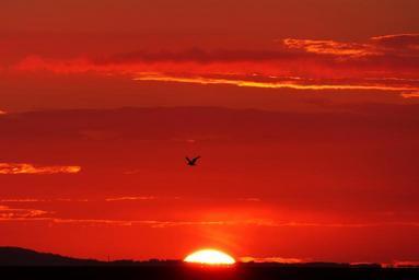 Keywords: glowing back light bird seagull sunset evening sky landscape clouds sea afterglow abendstimmung horizon water sun cloud orange boot mirroring denmark laesoe coast vesterø havn sinks silhouette romantic red mood evening weather mood