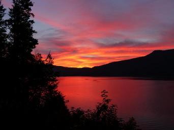 Keywords: glowing sun rise canim lake british columbia canada lake water hills mountains outside outdoor scenic landscape sky nature