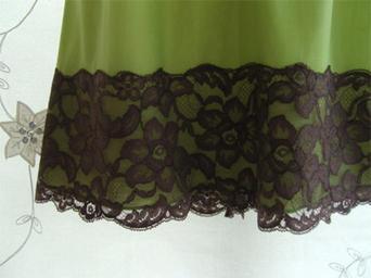 Keywords: Alas no longer in production, Glydons of Hollywood was arguably the first lingerie manufacturer in America to make slips that were sexy, rather than just functional. Now, any item made by Glydons commands attention from serious collectors worldwide. Recently sold to an overseas buyer, here we focus on an exquisite lime and chocolate 1950′s vintage half slip by Glydons. It has a double layer of the finest nylon and a 5-inch deep lace hem. The attention to detail and quality of manufacture is clear to see in the photographs, however the true joy is in the wearing. So elegant!