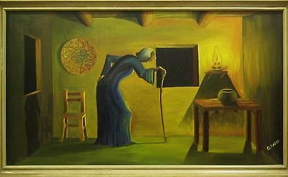 Keywords: Gmatta old lady 1200x700mm.jpg en THE OLD LADY Oil painting on fabric canvas May 1973 Size 1200x700mm own George Matta 1973-05 George Matta Paintings of old women