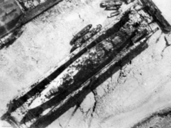 | Keywords: Gneisenau in dry dock at Kiel March 1942.jpg The German battleship Gneisenau in a floating dry dock at Kiel Germany after her passage through the Channel from Brest She was bombed and torpedoed at Brest France later mined and work was in progress on her and already a good deal of the deck plating had been removed from the bows Note the snow and ice On the night of 26/27 February 1942 the RAF bombed the battleship A bomb hit the powder magazine of turret A 112 sailors died and Gneisenau was decommissioned for the rest or the war SUK11783 ca 1942-03 Australian armed forces Image copyright Copyright expired - public domain frame cropped PD-Australia Gneisenau ship 1936 Kiel Black and white photographs |