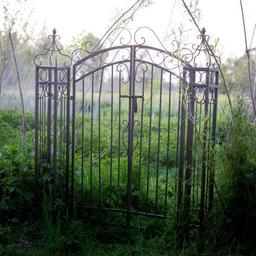 Keywords: goal metal old ornament iron railings blocked nature out fence gate sun overgrown wrought iron work