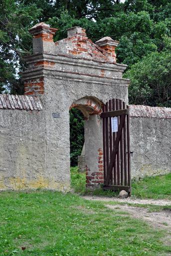 Keywords: goal wall input door old stone building structure brick plaster decay usedom mellenthin cemetery church churchyard farewell leave harmony rest death die sky