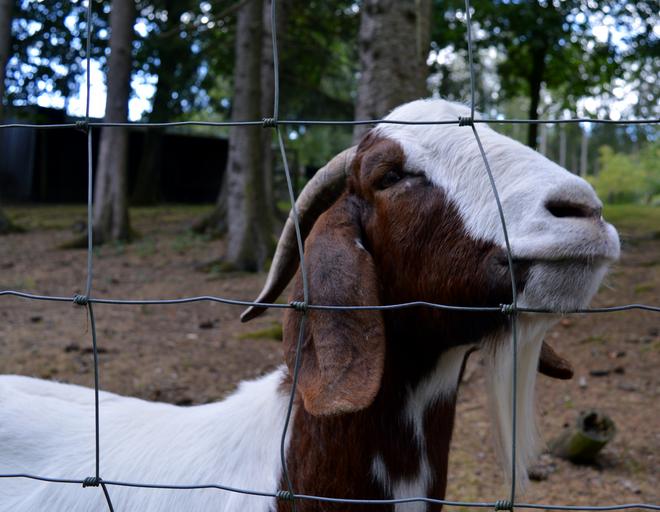 Keywords: goat billy goat goatee goat buck horned fur bock head pet wire fence metal fence wire mesh