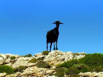 Keywords: goat billy goat horns animal livestock bock creature mammal wildlife photography nature sky menorca blue black steinig standing spain