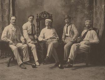 | Keywords: group portraits groupportraits groupshot people monochrome Photographer: Reuben R. Sallows (1855 - 1937) Description: Studio portrait of five middle-aged men seated, facing front. All wear light trousers, white shirts, laced bowling shoes. Man in centre, seated in high-backed carved chair, wears dark bow tie, white cap, moustache, wire framed glasses. Man to right of centre wears light striped suit, with jacket, dark tie, belt and fedora, has moustache and monocle. Two bowling balls in foreground. Writing on bottom of matte identify subjects: Goderich Bowling Club, Officers for 1903. From left to right, JNO. Galt, Member Committee; J.D. O'Connell, Secretary-Treasurer; R.G. Reynolds, President; W.L. Eliot, Member Committee; Wm. Lane, Vice-President. Object ID : 0470-rrs-ogohc-ph View additional photographs by Sallows that are held in other collections at the Reuben R. Sallows Digital Library. Order a higher-quality version of this item by contacting the Huron County Museum (fee applies). Photographer: Reuben R. Sallows (1855 - 1937) Description: Studio portrait of five middle-aged men seated, facing front. All wear light trousers, white shirts, laced bowling shoes. Man in centre, seated in high-backed carved chair, wears dark bow tie, white cap, moustache, wire framed glasses. Man to right of centre wears light striped suit, with jacket, dark tie, belt and fedora, has moustache and monocle. Two bowling balls in foreground. Writing on bottom of matte identify subjects: Goderich Bowling Club, Officers for 1903. From left to right, JNO. Galt, Member Committee; J.D. O'Connell, Secretary-Treasurer; R.G. Reynolds, President; W.L. Eliot, Member Committee; Wm. Lane, Vice-President. Object ID : 0470-rrs-ogohc-ph View additional photographs by Sallows that are held in other collections at the Reuben R. Sallows Digital Library. Order a higher-quality version of this item by contacting the Huron County Museum (fee applies). |