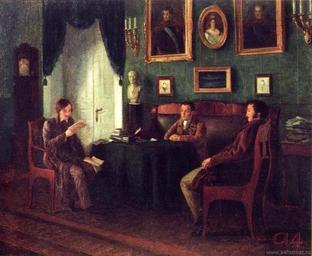 Keywords: Gogol and Zhukovsky at Pushkin's in Tsarskoe selo by P. Geller (1910).jpg Гоголь и Жуковский у Пушкина в Ца ском Селе Художник П Гелле 1910 http //www a4format ru/photo open php file 494a7e13 jpg 1910 П Гелле PD-Art Petr Geller Files uploaded by Shakko from various sources Aleksandr Pushkin in art Vasily Zhukovsky Nikolai Gogol in art |