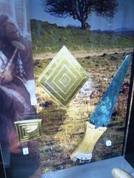 | Keywords: Gold lozenge, belt buckle, copper dagger, from Wilsford G5, Bush Barrow.jpg Gold lozenge gold belt buckle copper dagger Bronze Age grave goods from Wilsford G5 Bush Barrow Now in the Wiltshire Museum Devizes own Pasicles 2014-04-09 cc-zero Uploaded from Mobile Android 1 0beta13 Wiltshire Museum Bronze age daggers Bronze Age golden artefacts Bronze Age artefacts in the United Kingdom Bush Barrow Taken with Vodafone Smart III | ||||
