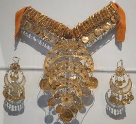 | Keywords: Gold plated copper alloy necklace and earings, Honolulu Museum of Art.JPG en Gold plated copper alloy necklace and earings from the Middle East possibly Egypt 20th century long-term loan to the Honolulu Museum of Art by Doris Duke Foundation for Islamic Art accession 90 72a-c own Hiart photo 2016 Islamic metalwork in the Honolulu Museum of Art Metalwork in the Doris Duke Foundation for Islamic Art Earrings Necklaces Islamic jewellery Jewellery of Egypt Art of Egypt in the Honolulu Museum of Art Cc-zero |