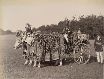 | Keywords: Golden carriage in Baroda in the 1890s.jpg en Photograph of a golden carriage at Baroda Gujarat from the Curzon Collection taken by an unknown photographer during the 1890s The two-wheeled solid gold carriage is drawn by caparisoned bullocks and belonged to Gaekwar Sayaji Rao III ruled 1875-1939 12th Maharaja of Baroda He owned a collection of unique modes of transport which included silver carriages and a miniature carriage drawn by deer They were displayed to visitors and used on ceremonial occasions s 1890 http //www oldindianphotos in/2010_07_09_archive html author other versions Custom license marker 2014 11 27 PD-100 Vadodara in the 1890s Uploaded with UploadWizard Ox-drawn carts in India 19th-century men of India British Library Photo 430 Curzon Collection |