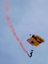 | Keywords: Golden Knights-27527-1.jpg A parachutist with the U S Army Parachute Team the Golden Knights glides to earth at the Huntsville International airshow in Madison County AL USA http //www kenthomas us KenThomas us personal website of photographer <br /> Photo taken with a Panasonic Lumix DMC-FZ50 2008-06-28 13 00-05 <sup>ISO 8601</sup> Ken Thomas This image is released to the public domain and therefore no permission or credit is required <br />Comments and/or feedback however are always welcome See my user page for contact info 34 38 33 76 N 86 46 43 76 W heading W Taken with Panasonic Lumix DMC-FZ50 Parafoils United States Army Parachute Team |
