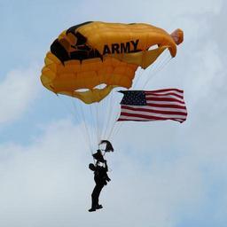 | Keywords: Golden Knights-27527-3.jpg A parachutist with the U S Army Parachute Team the Golden Knights glides to earth at the Huntsville International airshow in Madison County AL USA http //www kenthomas us KenThomas us personal website of photographer <br /> Photo taken with a Panasonic Lumix DMC-FZ50 2008-06-28 13 01-05 <sup>ISO 8601</sup> Ken Thomas This image is released to the public domain and therefore no permission or credit is required <br>Comments and/or feedback however are always welcome See my user page for contact info 34 38 33 76 N 86 46 43 76 W heading W Taken with Panasonic Lumix DMC-FZ50 Parafoils Photographs of flags of the United States United States Army Parachute Team |