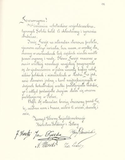 | Keywords: Goldenes Buch zum 70. Geburtstag August Bebel 1910 Seite 132.jpg Goldenes Buch zum 70 Geburtstag August Bebel 1910 Seite_ jpg 131 133 Glückwunschschreiben zum 70 Geburtstag von August Bebel Sozialdemokratische Partei Polens und Litauens August Bebel zum siebzigsten Geburtstag 22 Februar 1910 / mit einer Nachbemerkung von Ursula Herrmann Reprint des Unikats aus dem Zentralen Parteiarchiv der SED Dietz Verlag Berlin 1989 Lizenzausgabe Saur 1989 ISBN 3-598-07256-2 self scanned from own book 1910 Diverse PD-old-70-1923 Goldenes Buch zum 70 Geburtstag August Bebel 1910 |