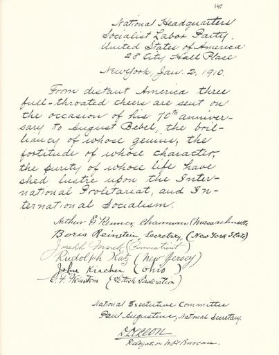| Keywords: Goldenes Buch zum 70. Geburtstag August Bebel 1910 Seite 140.jpg Goldenes Buch zum 70 Geburtstag August Bebel 1910 Seite_ jpg 139 141 Glückwunschschreiben zum 70 Geburtstag von August Bebel Sozialdemokratische Arbeiterpartei der USA August Bebel zum siebzigsten Geburtstag 22 Februar 1910 / mit einer Nachbemerkung von Ursula Herrmann Reprint des Unikats aus dem Zentralen Parteiarchiv der SED Dietz Verlag Berlin 1989 Lizenzausgabe Saur 1989 ISBN 3-598-07256-2 self scanned from own book 1910 Diverse PD-old-70-1923 Goldenes Buch zum 70 Geburtstag August Bebel 1910 |
