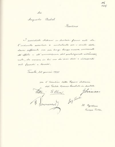 Keywords: Goldenes Buch zum 70. Geburtstag August Bebel 1910 Seite 145.jpg Goldenes Buch zum 70 Geburtstag August Bebel 1910 Seite_ jpg 144 146 Glückwunschschreiben zum 70 Geburtstag von August Bebel Italienische Sozialistische Arbeiterpartei in Österreich August Bebel zum siebzigsten Geburtstag 22 Februar 1910 / mit einer Nachbemerkung von Ursula Herrmann Reprint des Unikats aus dem Zentralen Parteiarchiv der SED Dietz Verlag Berlin 1989 Lizenzausgabe Saur 1989 ISBN 3-598-07256-2 self scanned from own book 1910 Diverse PD-old-70-1923 Goldenes Buch zum 70 Geburtstag August Bebel 1910 |
