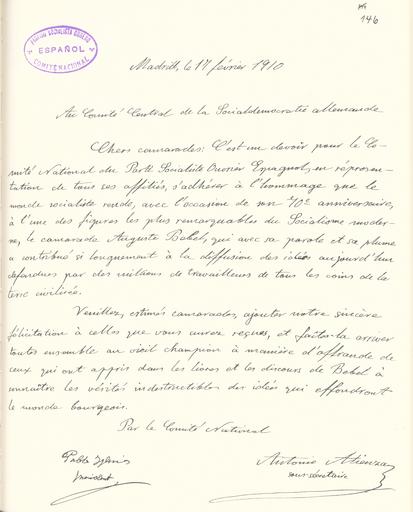 Keywords: Goldenes Buch zum 70. Geburtstag August Bebel 1910 Seite 146.jpg Goldenes Buch zum 70 Geburtstag August Bebel 1910 Seite_ jpg 145 147 Glückwunschschreiben zum 70 Geburtstag von August Bebel Sozialistische Arbeiterpartei Spanien August Bebel zum siebzigsten Geburtstag 22 Februar 1910 / mit einer Nachbemerkung von Ursula Herrmann Reprint des Unikats aus dem Zentralen Parteiarchiv der SED Dietz Verlag Berlin 1989 Lizenzausgabe Saur 1989 ISBN 3-598-07256-2 self scanned from own book 1910 Diverse PD-old-70-1923 Goldenes Buch zum 70 Geburtstag August Bebel 1910 |