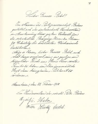 | Keywords: Goldenes Buch zum 70. Geburtstag August Bebel 1910 Seite 038.jpg Goldenes Buch zum 70 Geburtstag August Bebel 1910 Seite_ jpg 037 039 Glückwunschschreiben zum 70 Geburtstag von August Bebel SPD-Landesvorstand Baden August Bebel zum siebzigsten Geburtstag 22 Februar 1910 / mit einer Nachbemerkung von Ursula Herrmann Reprint des Unikats aus dem Zentralen Parteiarchiv der SED Dietz Verlag Berlin 1989 Lizenzausgabe Saur 1989 ISBN 3-598-07256-2 self scanned from own book 1910 Diverse Goldenes Buch zum 70 Geburtstag August Bebel 1910 PD-old-70-1923 |