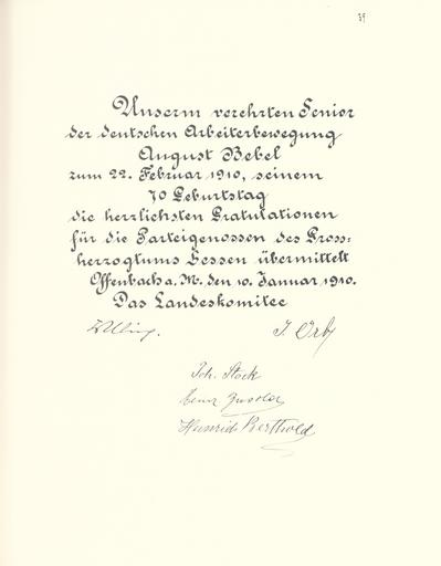 Keywords: Goldenes Buch zum 70. Geburtstag August Bebel 1910 Seite 039.jpg Goldenes Buch zum 70 Geburtstag August Bebel 1910 Seite_ jpg 038 040 Glückwunschschreiben zum 70 Geburtstag von August Bebel SPD-Landeskomitee Hessen August Bebel zum siebzigsten Geburtstag 22 Februar 1910 / mit einer Nachbemerkung von Ursula Herrmann Reprint des Unikats aus dem Zentralen Parteiarchiv der SED Dietz Verlag Berlin 1989 Lizenzausgabe Saur 1989 ISBN 3-598-07256-2 self scanned from own book 1910 Diverse Goldenes Buch zum 70 Geburtstag August Bebel 1910 PD-old-70-1923 |