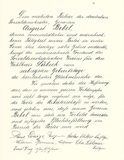 | Keywords: Goldenes Buch zum 70. Geburtstag August Bebel 1910 Seite 051.jpg Goldenes Buch zum 70 Geburtstag August Bebel 1910 Seite_ jpg 050 052 Glückwunschschreiben zum 70 Geburtstag von August Bebel Vorstand des Sozialdemokratischen Vereins für den Wahlkreis Lübeck August Bebel zum siebzigsten Geburtstag 22 Februar 1910 / mit einer Nachbemerkung von Ursula Herrmann Reprint des Unikats aus dem Zentralen Parteiarchiv der SED Dietz Verlag Berlin 1989 Lizenzausgabe Saur 1989 ISBN 3-598-07256-2 self scanned from own book 1910 Diverse Goldenes Buch zum 70 Geburtstag August Bebel 1910 PD-old-70-1923 |