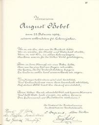 | Keywords: Goldenes Buch zum 70. Geburtstag August Bebel 1910 Seite 060.jpg Goldenes Buch zum 70 Geburtstag August Bebel 1910 Seite_ jpg 059 061 Glückwunschschreiben zum 70 Geburtstag von August Bebel Vorstand des Zentralvereins der Bildhauer Deutschlands August Bebel zum siebzigsten Geburtstag 22 Februar 1910 / mit einer Nachbemerkung von Ursula Herrmann Reprint des Unikats aus dem Zentralen Parteiarchiv der SED Dietz Verlag Berlin 1989 Lizenzausgabe Saur 1989 ISBN 3-598-07256-2 self scanned from own book 1910 Diverse Goldenes Buch zum 70 Geburtstag August Bebel 1910 PD-old-70-1923 |