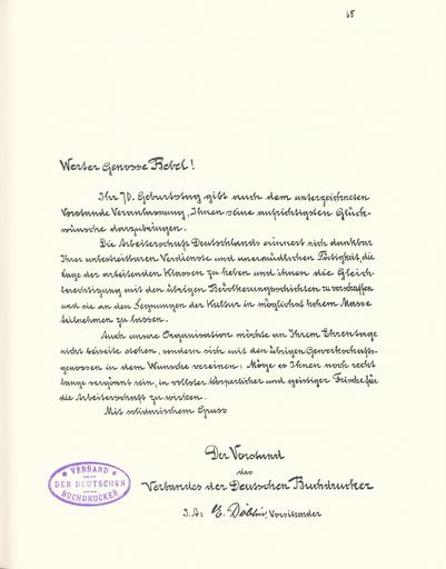 Keywords: Goldenes Buch zum 70. Geburtstag August Bebel 1910 Seite 065.jpg Goldenes Buch zum 70 Geburtstag August Bebel 1910 Seite_ jpg 064 066 Glückwunschschreiben zum 70 Geburtstag von August Bebel Vorstand des Verbandes der Deutschen Buchdrucker August Bebel zum siebzigsten Geburtstag 22 Februar 1910 / mit einer Nachbemerkung von Ursula Herrmann Reprint des Unikats aus dem Zentralen Parteiarchiv der SED Dietz Verlag Berlin 1989 Lizenzausgabe Saur 1989 ISBN 3-598-07256-2 self scanned from own book 1910 Diverse Goldenes Buch zum 70 Geburtstag August Bebel 1910 PD-old-70-1923