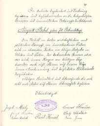 | Keywords: Goldenes Buch zum 70. Geburtstag August Bebel 1910 Seite 070.jpg Goldenes Buch zum 70 Geburtstag August Bebel 1910 Seite_ jpg 069 071 Glückwunschschreiben zum 70 Geburtstag von August Bebel Haupt-Vorstand des Zentral-Verbandes der Fleischer und Berufsgenossen Deutschlands August Bebel zum siebzigsten Geburtstag 22 Februar 1910 / mit einer Nachbemerkung von Ursula Herrmann Reprint des Unikats aus dem Zentralen Parteiarchiv der SED Dietz Verlag Berlin 1989 Lizenzausgabe Saur 1989 ISBN 3-598-07256-2 self scanned from own book 1910 Diverse Goldenes Buch zum 70 Geburtstag August Bebel 1910 PD-old-70-1923 |