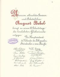 Keywords: Goldenes Buch zum 70. Geburtstag August Bebel 1910 Seite 087.jpg Goldenes Buch zum 70 Geburtstag August Bebel 1910 Seite_ jpg 086 088 Glückwunschschreiben zum 70 Geburtstag von August Bebel Hauptvorstand des Verbandes der Lithografen Steindrucker und verwandter Berufe August Bebel zum siebzigsten Geburtstag 22 Februar 1910 / mit einer Nachbemerkung von Ursula Herrmann Reprint des Unikats aus dem Zentralen Parteiarchiv der SED Dietz Verlag Berlin 1989 Lizenzausgabe Saur 1989 ISBN 3-598-07256-2 self scanned from own book 1910 Diverse PD-old-70-1923 Goldenes Buch zum 70 Geburtstag August Bebel 1910