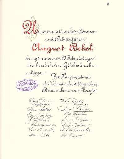 Keywords: Goldenes Buch zum 70. Geburtstag August Bebel 1910 Seite 087.jpg Goldenes Buch zum 70 Geburtstag August Bebel 1910 Seite_ jpg 086 088 Glückwunschschreiben zum 70 Geburtstag von August Bebel Hauptvorstand des Verbandes der Lithografen Steindrucker und verwandter Berufe August Bebel zum siebzigsten Geburtstag 22 Februar 1910 / mit einer Nachbemerkung von Ursula Herrmann Reprint des Unikats aus dem Zentralen Parteiarchiv der SED Dietz Verlag Berlin 1989 Lizenzausgabe Saur 1989 ISBN 3-598-07256-2 self scanned from own book 1910 Diverse PD-old-70-1923 Goldenes Buch zum 70 Geburtstag August Bebel 1910 |