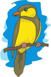 Keywords: goldfinch bird yellow brown wildlife blue background still life sitting tree branch