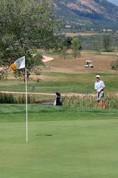 Keywords: golfer golfing green chip putting putter club ball course grass tournament competition game sport outdoors man play recreation activity fairway shot swing hit flag hole trees nature view