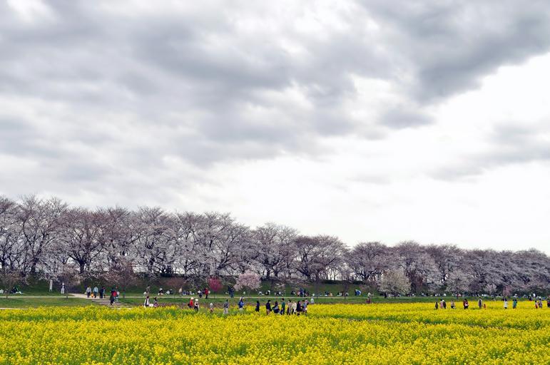 Keywords: gongendo park japan cherry trees flowers people nature outside countryside sky clouds