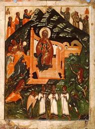 | Keywords: Собор Богоматери - Google Art Project.jpg Artwork Q18683173 RusIcon П аздник Собо а Богомате и в п авославной т адиции отмечается на следующий день после Рождества Х истова Данная икона является самой анней с еди созданных на усской почве икон на тему ождественской стихи ы «Что ти п инесем Х исте яко явился еси на земли яко человек нас ади каяждо благода ение Тебе п иносят ангеле пение небеса звезду волсви да ы пасты и чудо земля ве теп мы же ате ь Дево » В цент е композиции п едставлена Богомате ь восседающая на т оне с изоб ажением Х иста Эммануила в восьмиконечной двухцветной славе Все пе сонажи изоб аженные на иконе в соответствии с текстом стихи ы п еподносят свои да ы В ве хних углах иконы небольшие изоб ажения Св иколая и Св Па аскевы Ст астная темпе аментная живопись коло ит пост оенный на сочетании темно-зеленых изум удных тонов с ко алловыми и ко ичневыми белильные п обела положенные эне гичными мазками дают наилучшее п едставление о псковской живописи конца XIV начала XV века Late 14 - beginning of the 15th century Tempera wood cm 81 61 Institution Tretyakov Gallery 58 object history credit line accession number YAFnQkfTXJi19Q PD-old-100 http //www tretyakovgallery ru/ru/collection/_show/image/_id/2608 Google Art Project works in The State Tretyakov Gallery Synaxis of the Theotokos 14th-century icons in the Tretyakov Gallery 15th-century icons in the Tretyakov Gallery Google Art Project works by unknown artist Russia |