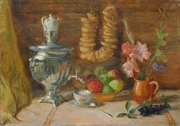 | Keywords: Gorelov rostislav.jpg en Gorelov R G ru Ка тина атю мо т с самова ом Художник Го елов Ростислав Гав илович од 1916 по подписи Живописец г афик Жан ист по т етист Сын живописца Г Го елова 1880 1966 В 1942 окончил осковский художественный институт по масте ской Г Г Ряжского Участник выставок с 1942 осква Авто тематических ка тин посвященных Великой Отечественной войне Один из я ких п едставителей соц еализма С 1961 п еподавал в осковском педагогическом институте П оизведения х анятся в узее исто ии осквы музеях Я ославля Волгог ада Ульяновска Пе ми д угих соб аниях России Ге мании Ф анции Италии Англии атю мо т с самова ом Холст ка тон масло 50х70 Подпись све ху Частная коллекция Го елов Ростислав Гав илович по подписи 1939 атю мо т с самова ом 1939 PD-Art Oil still life paintings Still life paintings of flowers Still life paintings of fruits Samovar in art Still life paintings of tableware Still life paintings from Russia Private collections in Russia 1930s still-life paintings |