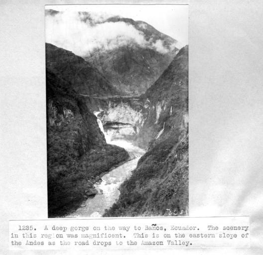 | Keywords: smithsonian institution smithsonianinstitution smithsonian institution archives smithsonianinstitutionarchives blackandwhite monochrome black and white Creator: A.S. Hitchcock Type: black-and-white photograph, 4.75 x 3 inches Date: c.1923-1924 Local number: SIA2011-0568 Summary: A deep gorge near Baños, Ecuador. The scenery in this region was magnificent. This is on the eastern slope of the Andes as the road drops to the Amazon Valley. Cite as: SIA RU 000229 - Smithsonian Institution Archives Repository:Smithsonian Institution Archives View more collections from the Smithsonian Institution. Creator: A.S. Hitchcock Type: black-and-white photograph, 4.75 x 3 inches Date: c.1923-1924 Local number: SIA2011-0568 Summary: A deep gorge near Baños, Ecuador. The scenery in this region was magnificent. This is on the eastern slope of the Andes as the road drops to the Amazon Valley. Cite as: SIA RU 000229 - Smithsonian Institution Archives Repository:Smithsonian Institution Archives View more collections from the Smithsonian Institution. |