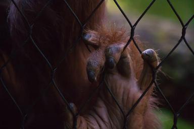 Keywords: gorilla animal monkey cage imprisoned finger fence ape mammal fur powerful leader animal world thinking meditate consider lonely threat sad habitat eradication
