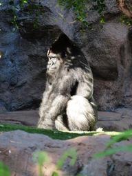 Keywords: gorilla monkey view grim ape black mammal animal silverback leader silvery grey fur large powerful imposing mountain gorilla dominant consider thinking meditate