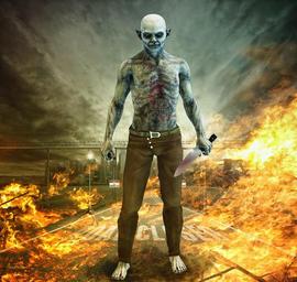 Keywords: gothic fantasy macabre horror dark zombie evil portrait male scary fantasy male knife flames city restricted area the walking dead virus z apocalyptic