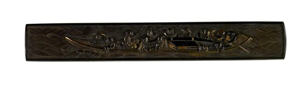 Keywords: Gotô Tatsujô - Kozuka with Soldiers and a Palanquin on a Boat - Walters 51637.jpg Thirteen soldiers guard a palanquin on a boat The reverse of the kozuka is gold with cat scratch neko-gake incisions between 1665 1709 Edo copper silver patina gold and silver cm 9 6 l accession number 51 637 20405 Henry Walters Baltimore date and mode of acquisition unknown Walters Art Museum Henry Walters Acquired by Henry Walters Signature Gotô Mitsufusa place of origin Kyoto Japan Walters Art Museum license Kozuka in the Walters Art Museum Gotô Tatsujô Media contributed by the Walters Art Museum needs category review |