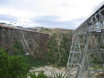 | Keywords: GouritzRiverBridges.jpg Gourits River Bridges right railroad steel bridge left historic rail road steel bridge left behind historic bridge road concrete bridge Gourits River Brücken rechts die Eisenbahnbrücke aus Stahl links die historische Schienen-/Straßenbrücke aus Stahl links dahinter die Straßenbrücke aus Beton Own 03 02 2008 M Uebel 34 11 6 32 S 21 45 15 09 E region ZA_heading W Gourits River Bridge Bungee jumping | ||||