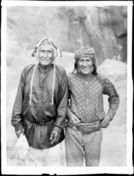 | Keywords: Governor Eusebius and Sheriff Louis of the pueblo of Acoma, New Mexico, 1886 (CHS-4544).jpg en <br> Governor Eusebius and Sheriff Louis of the pueblo of Acoma New Mexico 1886 Photograph of Governor Eusebius and Sheriff Louis of the pueblo of Acoma New Mexico 1886 The two stand next to each other outside The Governor can be seen at left wearing a long-sleeved shirt with a cord hanging from his neck white pants and a polka-dot cloth around his head The Sheriff is visible at right wearing a dark patterned long-sleeved shirt with plaid pants and a cloth wrapped around his head They are both smiling Call number CHS-4544 Photographer James George Wharton Filename CHS-4544 Coverage date 1886 Part of collection California Historical Society Collection 1860-1960 Type images Geographic subject city or populated place Acoma Repository name USC Libraries Special Collections Accession number 4544 Microfiche number 1-160-58 Archival file chs_Volume96/CHS-4544 tiff Part of subcollection Title Insurance and Trust and C C Pierce Photography Collection 1860-1960 Repository address Doheny Memorial Library Los Angeles CA 90089-0189 Geographic subject country USA Format aacr2 2 photographs transparency photoprint b w ; 25 x 20 cm 22 x 17 cm Rights Digitally reproduced by the USC Digital Library; From the California Historical Society Collection at the University of Southern California Subject adlf tribal areas Project USC Repository email specol usc edu Identifying number unidentified no James-1373 Contributing entity California Historical Society Date created 1886 Publisher of the digital version University of Southern California Libraries Format aat transparencies; photographic prints; photographs Geographic subject state New Mexico Legacy record ID chs-m16879; USC-1-1-1-13461 Access conditions Send requests to address or e-mail given Phone 213 821-2366; fax 213 740-2343 Subject file heading Indians -- Acoma Subject lcsh Indians of North America; Acoma Indians; Men Subject Acoma Indians; Eusebius Governor; Louis Sheriff; Acoma; Acoma Indians 1886 date created George Wharton James 1858 1923 http //digitallibrary usc edu/cdm/ref/collection/p15799coll65/id/16801 PD-old-70-1923 Images from USC Digital Library uploaded by Fæ Photographs by George Wharton James California Historical Society Collection 1860-1960 Acoma Pueblo |