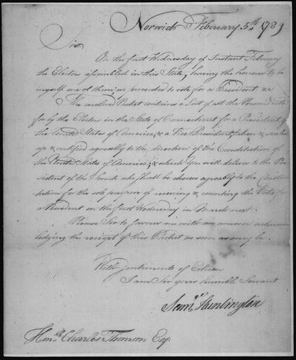 | Keywords: Governor Samuel Huntington letter transmitting a list of all the persons voted for by the electors in the state of Conne - NARA - 306208.tif Local identifier U S Senate 03/04/1789 - Center for Legislative Archives NWL National Archives Building Room 8E 7th and Pennsylvania Avenue NW Washington DC 20408 1789-02-05 Record group Record Group 46 Records of the U S Senate 1789 - 2011 Record group ARC 375 Credentials compiled 1789 - 1998 Series ARC 306203 Variant control numbers NAIL Control Number NWL-46-ELECTION-1AH1-1 General notes Scope and content File unit File unit ARC yes <gallery> File Governor Samuel Huntington letter transmitting a list of all the persons voted for by the electors in the state of Conne - NARA - 306208 tif TIFF File Governor Samuel Huntington letter transmitting a list of all the persons voted for by the electors in the state of Conne - NARA - 306208 jpg JPEG </gallery> NARA-cooperation PD-USGov Manuscript letters written messages Documents in English 1789 documents NARA TIF images with categorized JPGs |