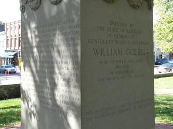 | Keywords: Governor William Goebel by Charles Henry Niehaus - Frankfort, Kentucky - DSC09279.JPG en Statue of Governor William Goebel by Charles Henry Niehaus 1855-1935 Frankfort Kentucky USA Dedicated March 11 1914 This artwork is now in the public domain because the artist died more than 70 years ago Smithsonian SIRIS Control Number IAS 75005256 Inscription C H Niehaus Cast by Roman Bronze Works Inscribed on marble GOVERNOR/WILLIAM GOEBEL/THE ABLE AND MOST EFFECTIVE ADVOCATE/AND CHAMPION OF THE PEOPLE'S CAUSE/THEIR LOVED AND LOYAL FRIEND /ON JANUARY 30TH 1900 HE WAS SHOT/DOWN BY AN ASSASSIN FROM THE PRIVATE/OFFICE OF THE THEN SECRETARY OF STATE /BORN JANUARY 4TH 1856/DIED FEBRUARY 3 1900/ TELL MY FRIENDS TO BE/BRAVE AND FEARLESS AND LOYAL/TO THE GREAT COMMON PEOPLE /HIS LAST WORDS On right side of base text by William Jennings Bryan On left side of base SERVED AS STATE SENATOR/FOURTEEN YEARS/1886 TO 1900/MEMBER OF/CONSTITUTIONAL CONVENTION /1890 TO 1819/AUTHOR OF/THE ANTI LOTTERY/FRANCHISE TAX LAW/THE PIONEER IN/AMERICAN RAILWAY/REGULATION LAW/THE CHAMPION OF/SCHOOL BOOK LEGISLATION/FELLOW SERVANT LAW/EMPLOYEES LIABILITY LAW On back of base ERECTED BY/THE STATE OF KENTUCKY/IN MEMORY OF/KENTUCKY'S MARTYR GOVERNOR/WILLIAM GOEBEL/WHO DEVOTED AND HAVE/HIS LIFE/IN DEFENSE OF/THE RIGHTS OF THE PEOPLE/'THE QUESTION IS ARE THE CORPORATIONS/THE MASTERS OR THE SERVANTS OF THE PEOPLE signed Founder's mark appears Daderot 2012-10-09 11 31 14 Daderot cc0 cc0 Governor William Goebel by Charles Henry Niehaus |