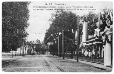 | Keywords: Governor's break before the arrival of Nicholas II.jpg en Governor's break now - the October Revolution Street before the arrival of Nicholas II Right - the house of Smolensk Governor now - the art school the left - the district council now - the Mayor's Office of Smolensk in the background - a fragment of the city wall ru Губе нато ский п олом ныне - улица Октяб ьской еволюции пе ед п иездом иколая Вто ого Сп ава - дом смоленского губе нато а ныне - художественная школа слева - земская уп ава ныне - мэ ия Смоленска на заднем плане - ф агмент к епостной стены О игинальная отк ытка е установлены before 1917 года PD-RusEmpire 20th-century postcards of Russia Postcards of Smolensk Zemstvo |