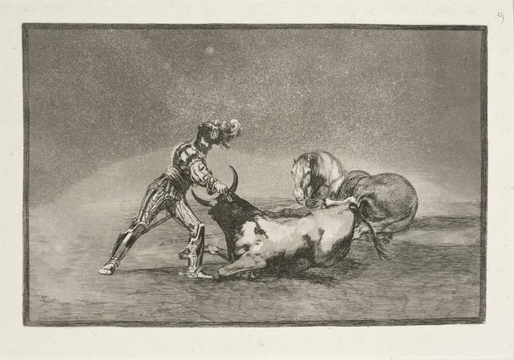Keywords: Goya - Um cavaleiro espanhol mata um touro (Tauromaquia).jpg Artwork Creator Francisco de Goya y Lucientes A Spanish bullfighter kills a bull after losing his horse from the set Tauromachia Um cavaleiro espanhol mata um touro após ter perdido o cavalo da série Tauromaquia - 1815 1516 etching cm 32 7 44 5 MASP São Paulo Brazil This print is the ninth of a set of 33 engravings created by Goya in 1815 and published in 1816 called Tauromachia This engraving is part of the first edition of the set and belonged to the private collection of the French poet Victor Hugo The print is now conserved at the São Paulo Museum of Art in Brazil together with other four engravings from the first edition http //www masp art br/masp2010/acervo_detalheobra php id 134 PD-old-100 Other versions 19th-century engravings Prints in the Museu de Arte de São Paulo Etchings by Francisco de Goya La Tauromaquia Tauromaquia 19th-century prints in Brazil |