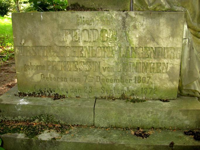 Keywords: Grab Feodora Fürstin zu Hohenlohe Langenburg, geb. Prinzessin von Leiningen, Inschrift Sockel.JPG Grab in Baden-Baden Feodora Fürstin zu Hohenlohe Langenburg geb Prinzessin von Leiningen Grabplatte Sockelinschrift own Groth-Pfeifer 2011-04 Groth-Pfeifer at http //de wikipedia org de wikipedia Groth-Pfeifer Original upload log page de wikipedia Grab_Feodora_F C3 BCrstin_zu_Hohenlohe_Langenburg 2C_geb _Prinzessin_von_Leiningen 2C_Inschrift_Sockel JPG 2011-04-28 20 48 Groth-Pfeifer 1600×1200× 1592048 bytes <nowiki> Information Grab in Baden-Baden Feodora Fürstin zu Hohenlohe Langenburg geb Prinzessin von Leiningen Grabplatte Sockelinschrift Fotografie selbst erstellt Groth-Pfeifer Datum </nowiki> Princess Feodora of Leiningen Hauptfriedhof Baden-Baden |