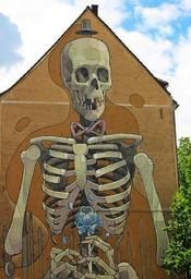 Keywords: graffiti hauswand skeleton skelet art sprayer wall painting painting spray wall facade street art housewife downtown cologne skeleton with flower modern sky clouds
