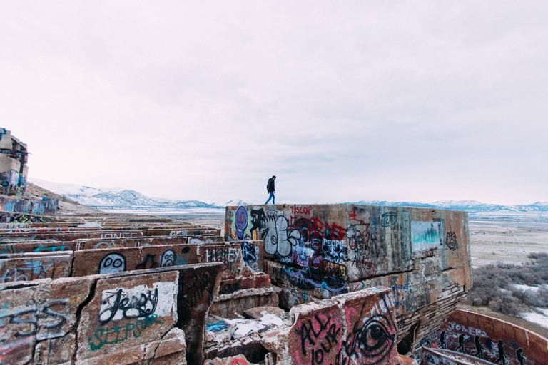 Keywords: graffiti walls ruins graffiti walls mountains man walking male ruined architecture urban art vandalism nature versus man nature landscape