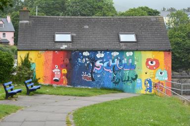 Keywords: grafitti home away meadow facade painted house building painted housewife sprayer art colorful ireland schull county cork